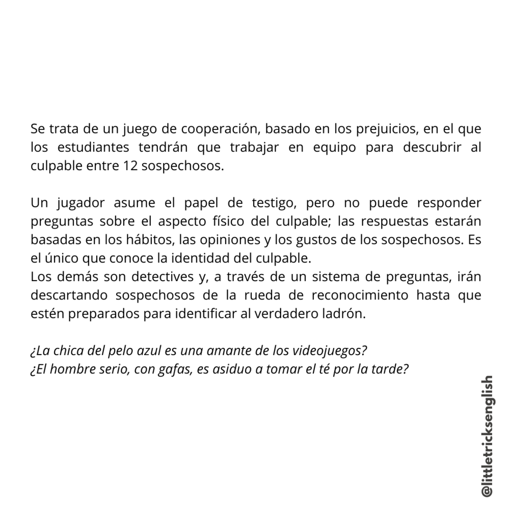 Se trata de un juego de cooperación, basado en los prejuicios, en el que los estudiantes adoptarán el rol de detective y tendrán que trabajar en equipo para descubrir al culpable entre 12 sospechosos.